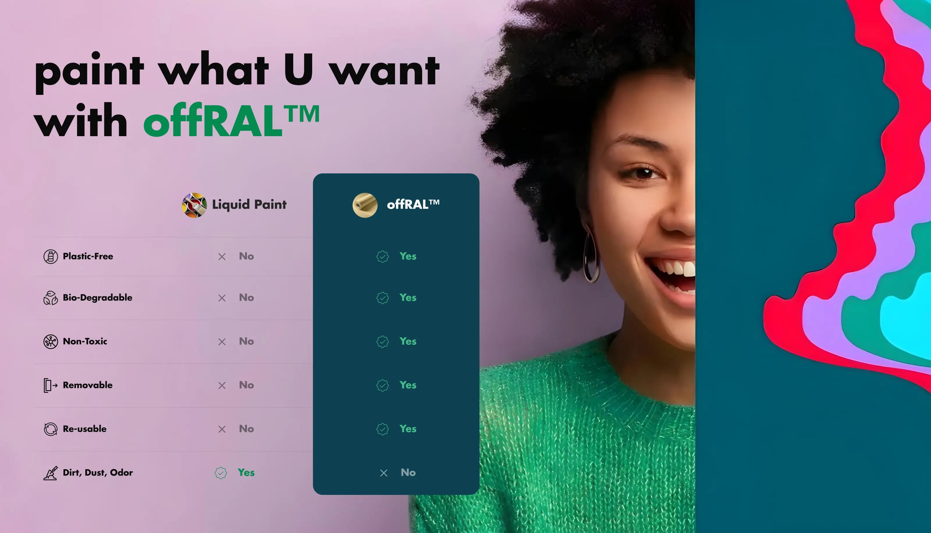 Verleihen Sie Ihren Wänden und Ihrem Personal mit offRAL™ ein wirklich umweltfreundliches Makeover – der ersten biologisch abbaubaren Farbe 2.0 in Rollen vom Wissenschaftlerkollektiv RALRAW ™ der Generation Z, hergestellt mit 🖤 speziell für Sie und Ihre Mutter 🌍