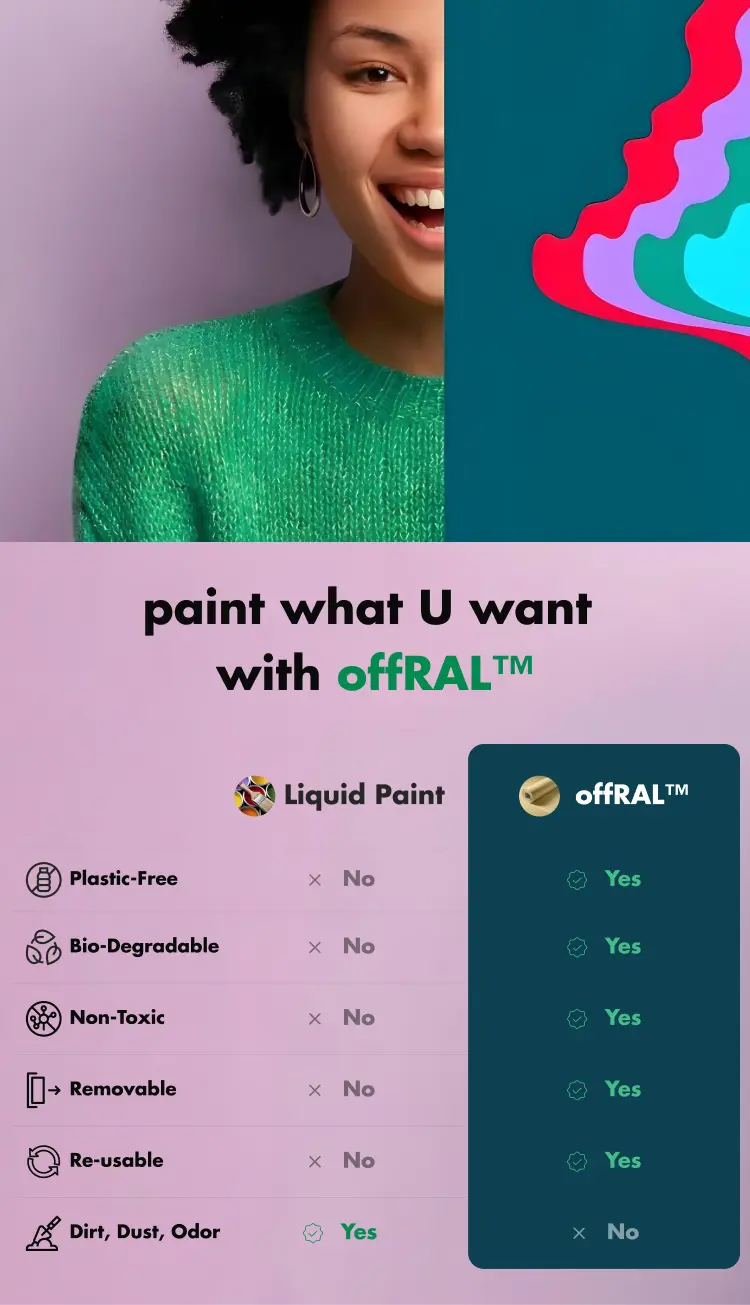 Wir haben uns vom übermäßigen Wasserverbrauch verabschiedet, der für die Herstellung herkömmlicher Flüssigfarben erforderlich ist, und so die Umweltbelastung erheblich verringert. Jetzt ist es so einfach, ein biologisch abbaubares, atmungsaktives Blatt in leuchtender Farbe von der Rolle abzuziehen und es auf einer beliebigen Wand oder flachen Oberfläche glatt zu streichen. Und schon sind Sie fertig. Mit offRAL™ treffen Sie eine Wahl, die die Umwelt schont und perfekt zu Ihrem Raum passt.